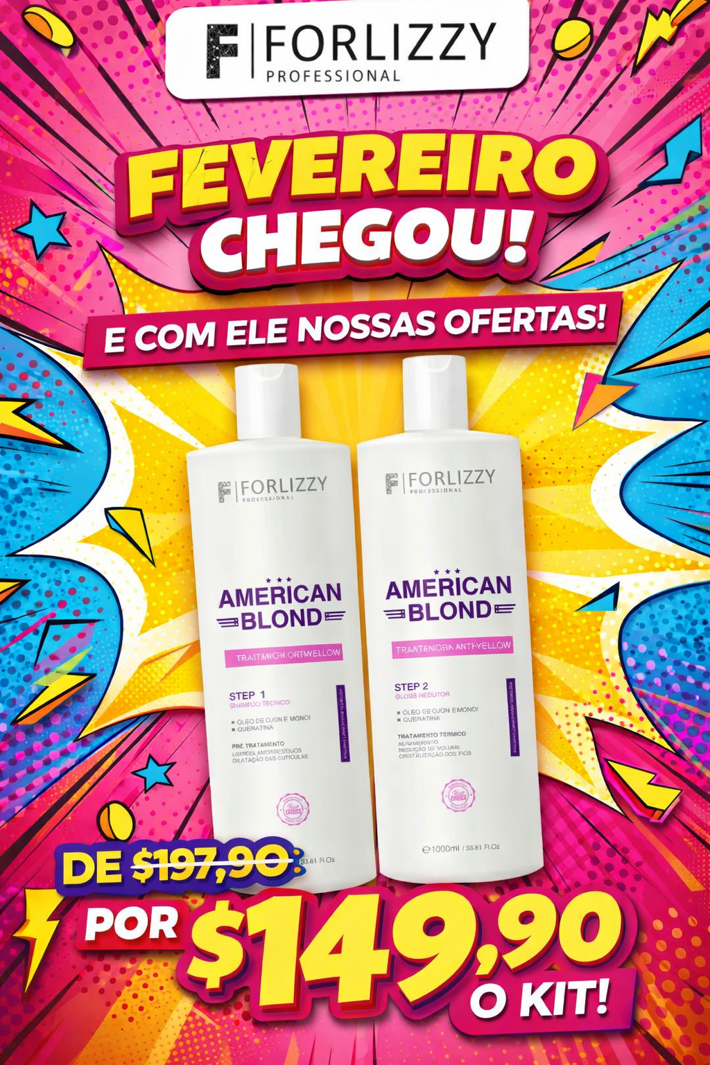 O American Blond - Redutor da linha ForLizzy proporciona cabelos mais lisos, brilhantes e com menos volume, além de hidratar e nutrir os fios.